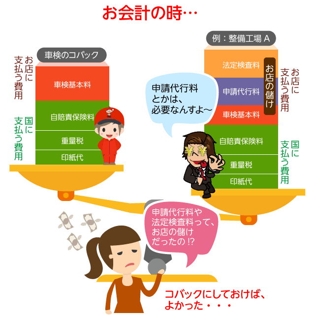 コバック車検に必要な費用は、「車検基本料」と「国に支払う費用(自賠責保険料・重量税・印紙代)」だけです。